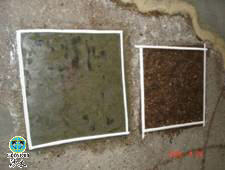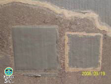 Fig. 6 show the foam pipe is adhesive with double side tape on the concrete surface with moist primer. The left sample is applied as A method and the right is applied as B method. After 10 days scouring with high speeding silt-laden flow, the speed is more than