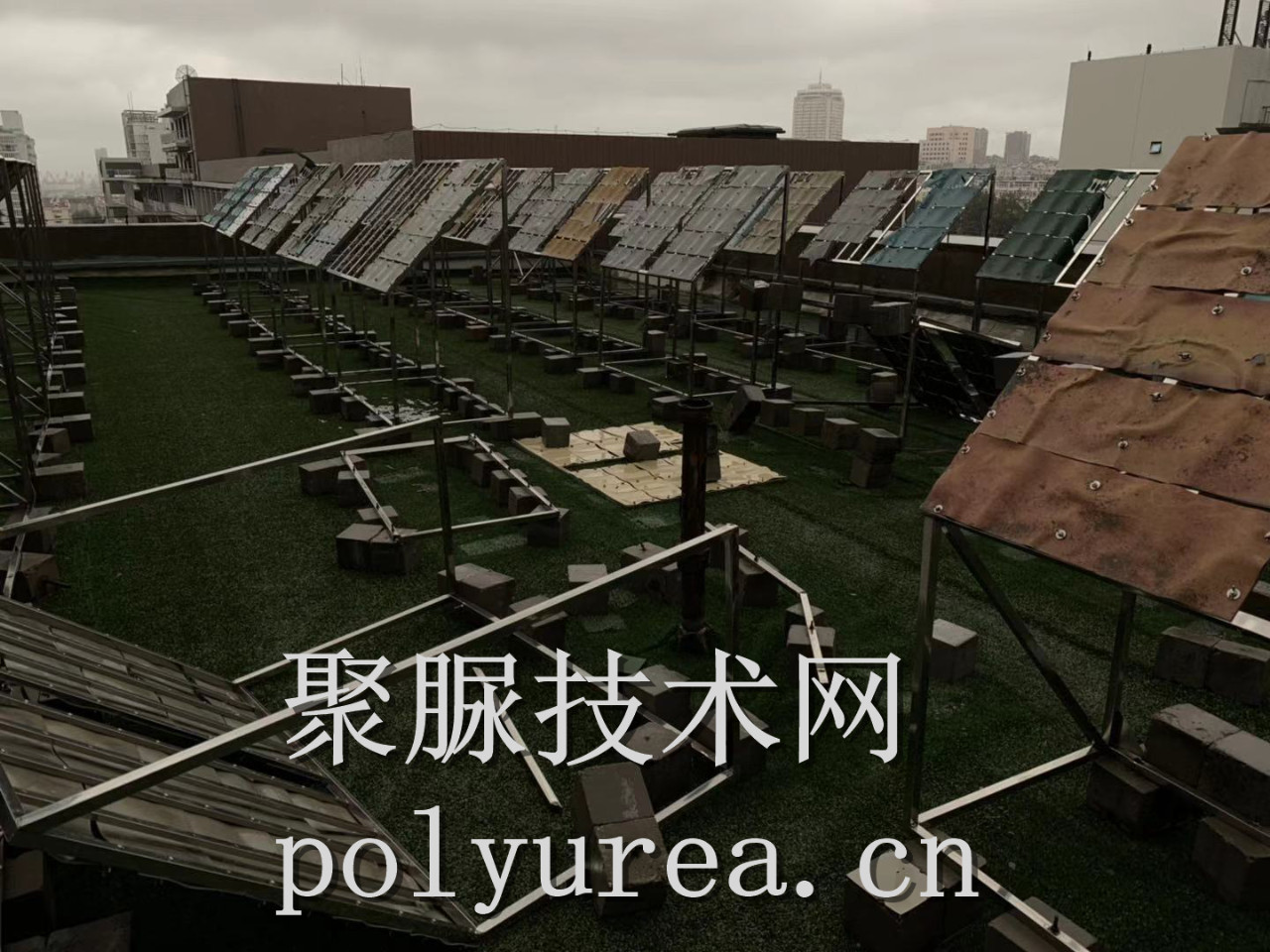 青島理工大學2#實驗樓沒有電梯,他就親自動手帶領(lǐng)研究生將上千塊的混凝土壓塊搬運至五樓樓頂,總計超過5000公斤;設(shè)計、建造適合噴涂聚脲材料布放的不銹鋼架;噴涂大量純聚脲、半聚脲試驗樣品。通過近十年的觀察、測試、研究,證明:1、純聚脲能夠保持原值85%以上的力學性能,2、半聚脲的力學性能僅維持在初期的2—3年,之后,性能急劇下降,并迅速降解為廢渣。